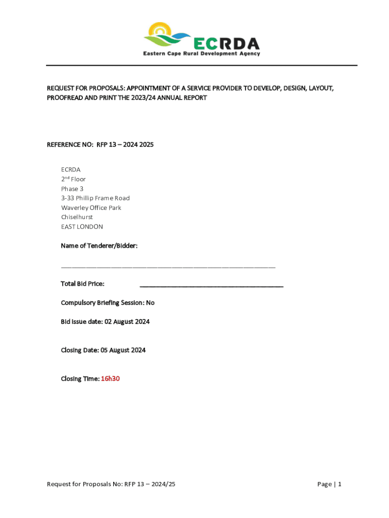 REQUEST FOR PROPOSALS: APPOINTMENT OF A SERVICE PROVIDER TO DEVELOP, DESIGN, LAYOUT, PROOFREAD AND PRINT THE 2023/24 ANNUAL REPORTREFERENCE NO: RFP 13 2024 2025ECRDA 2nd Floor Phase 3 333 Phillip