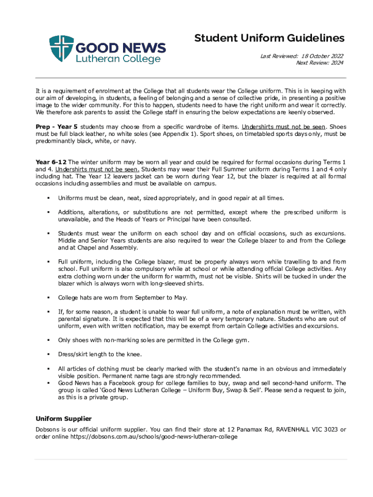Student Uniform Guidelines Last Reviewed: 18 October 2022 Next Review: 2024It is a requirement of enrolment at the College that all students wear the College uniform. This is in keeping with our aim