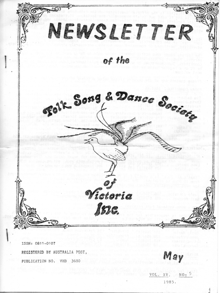\'ISSN:08110107REGISTERED BY AUSTRALIA POST, PUBLICATION NO.VHB3680VOL.XV:1985 .No:5This publication is the official Newsletter of the Folk Song & Dance Society of uictrria and is sent out to all