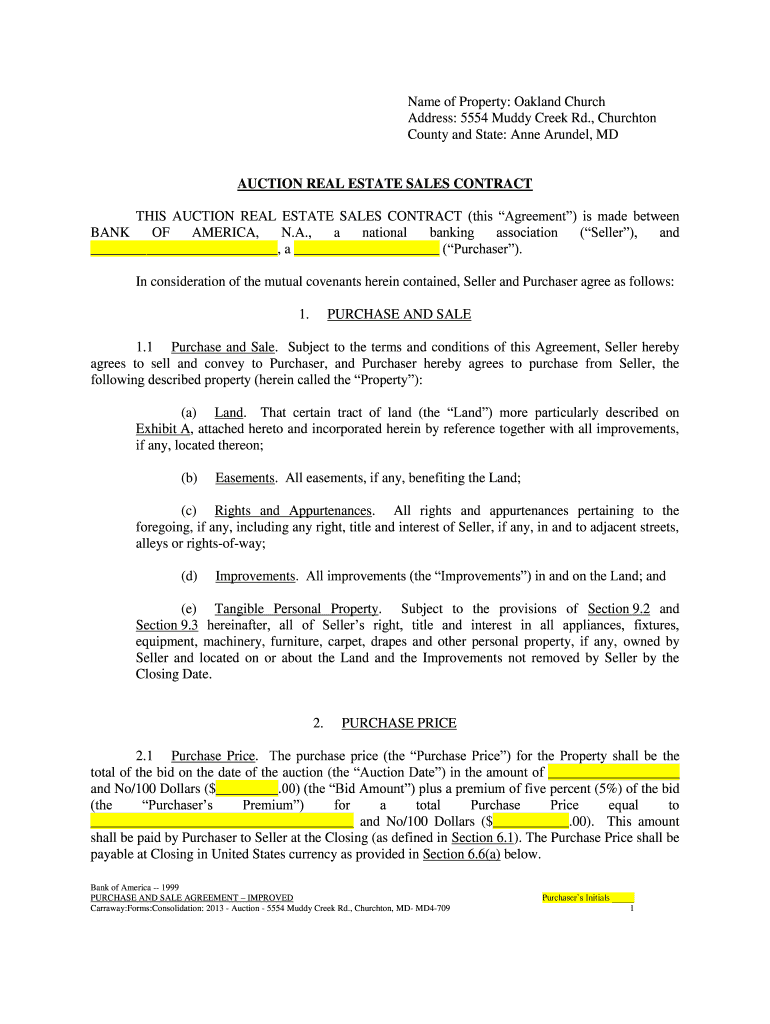 Name of Property: Oakland Church Address: 5554 Muddy Creek Rd., Church ton County and State: Anne Roundel, MD AUCTION REAL ESTATE SALES CONTRACT THIS AUCTION REAL ESTATE SALES CONTRACT (this Agreement)