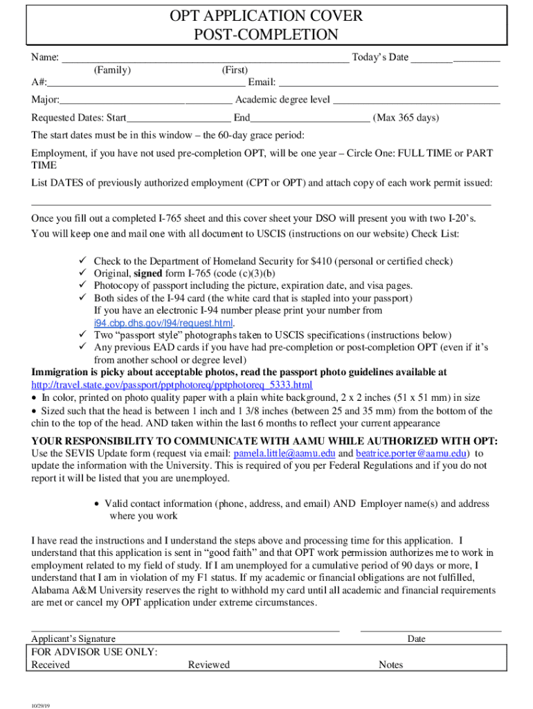 This document serves as a cover sheet for the post-completion OPT application, detailing the necessary information and requirements for students applying for Optional Practical Training after completing their degree. It outlines the applicant\'s personal information, the application checklist, and important guidelines regarding employment and communication with the university during the OPT period.