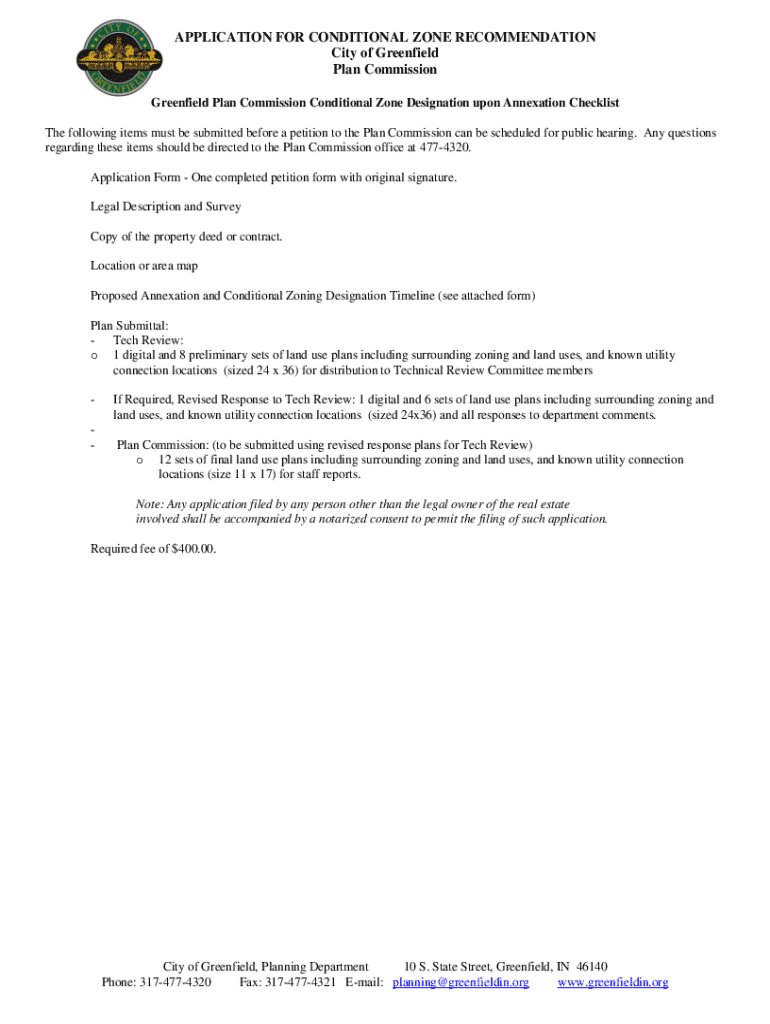 This application outlines the necessary steps and requirements for obtaining a conditional zoning designation upon annexation in the City of Greenfield. It includes details about the required documentation, fees, procedures, and public hearing notifications to facilitate the annexation process.