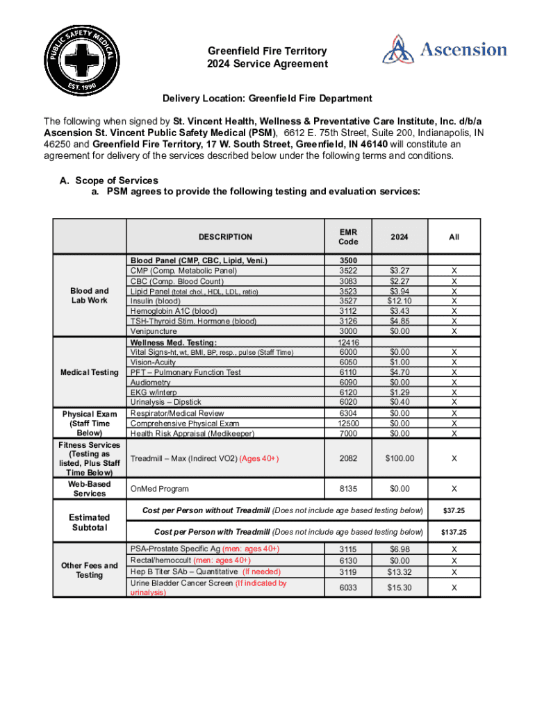 This document outlines the service agreement between St. Vincent Health\'s Public Safety Medical and the Greenfield Fire Territory for delivery of testing and evaluation services, including details on scope of services, pricing, billing policies, and conditions of agreement for medical services provided to the fire department personnel.