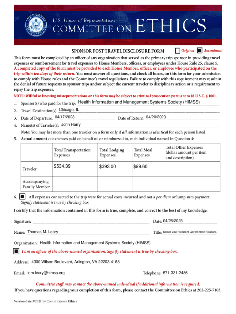 This form is utilized for disclosing the receipt of travel expenses from private sources for travel undertaken in connection with official duties. It is required by House Rule 25 to be filed within 15 days after the completion of travel, and it must be accompanied by certain disclosures and approvals related to the travel expenses.