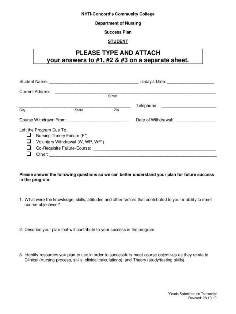 NHTIConcords Community College Department of Nursing Success Plan STUDENTPLEASE TYPE AND ATTACH your answers to #1, #2 & #3 on a separate sheet.Student Name: ___ Todays Date: ___ Current Address: