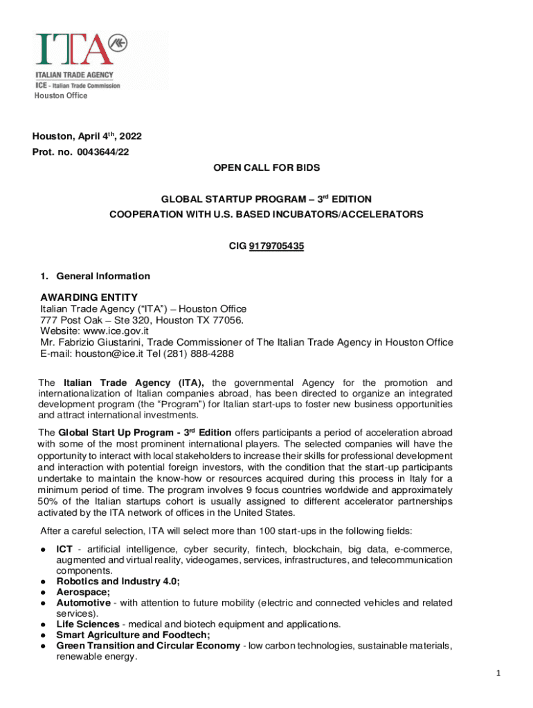 Houston OfficeHouston, April 4th, 2022 Prot. no. 0043644/22 OPEN CALL FOR BIDS GLOBAL STARTUP PROGRAM 3rd EDITION COOPERATION WITH U.S. BASED INCUBATORS/ACCELERATORS CIG 9179705435 1. General InformationAWARDING