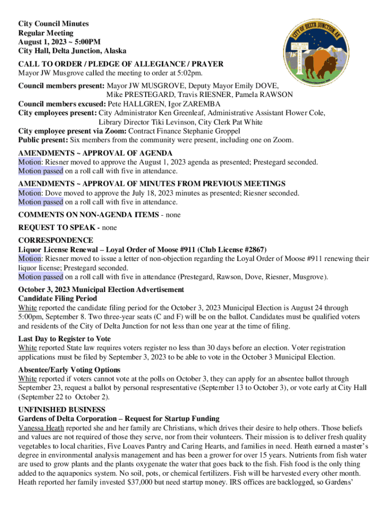 Minutes from the City Council regular meeting held on August 1, 2023, in Delta Junction, Alaska. The document includes details on council members present, agenda approval, previous meeting minutes approval, public comments, request for liquor license renewal, updates on municipal election, discussions on landfill rates and funding requests, and various reports from city officials.