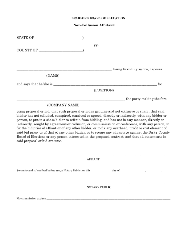 The affidavit typically requires the name of the entity, identification of the bid or contract, a declaration of non-collusion, and the signature of an authorized representative.