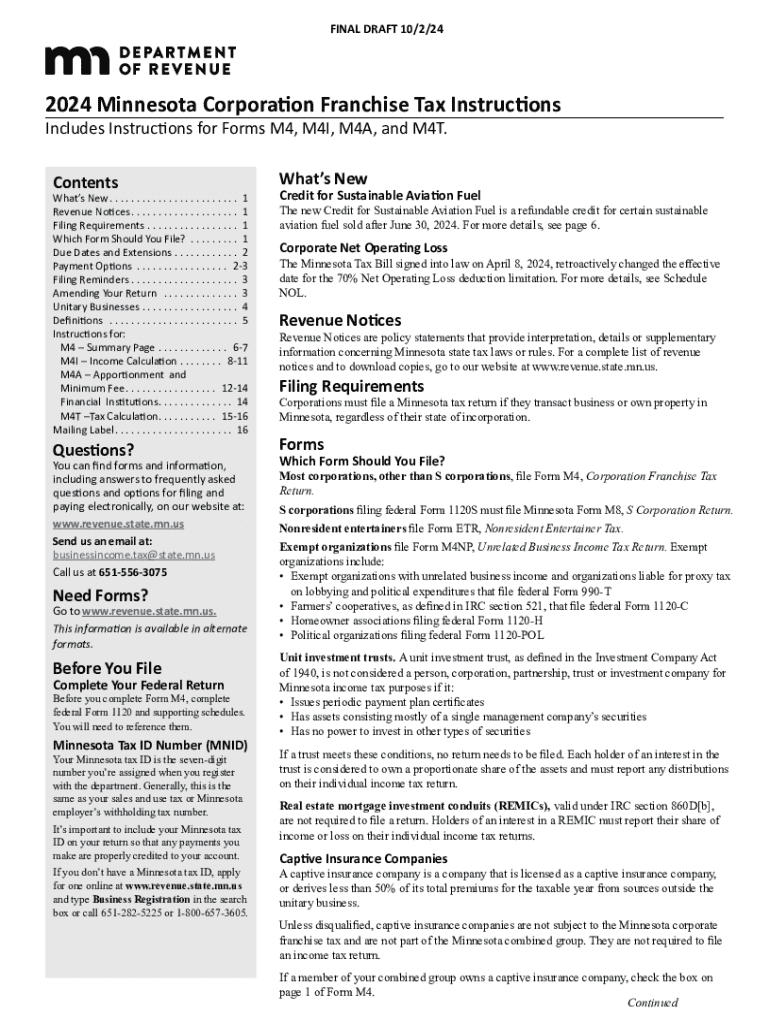 Get the free 2024 Minnesota Corporation Franchise Tax Instructions