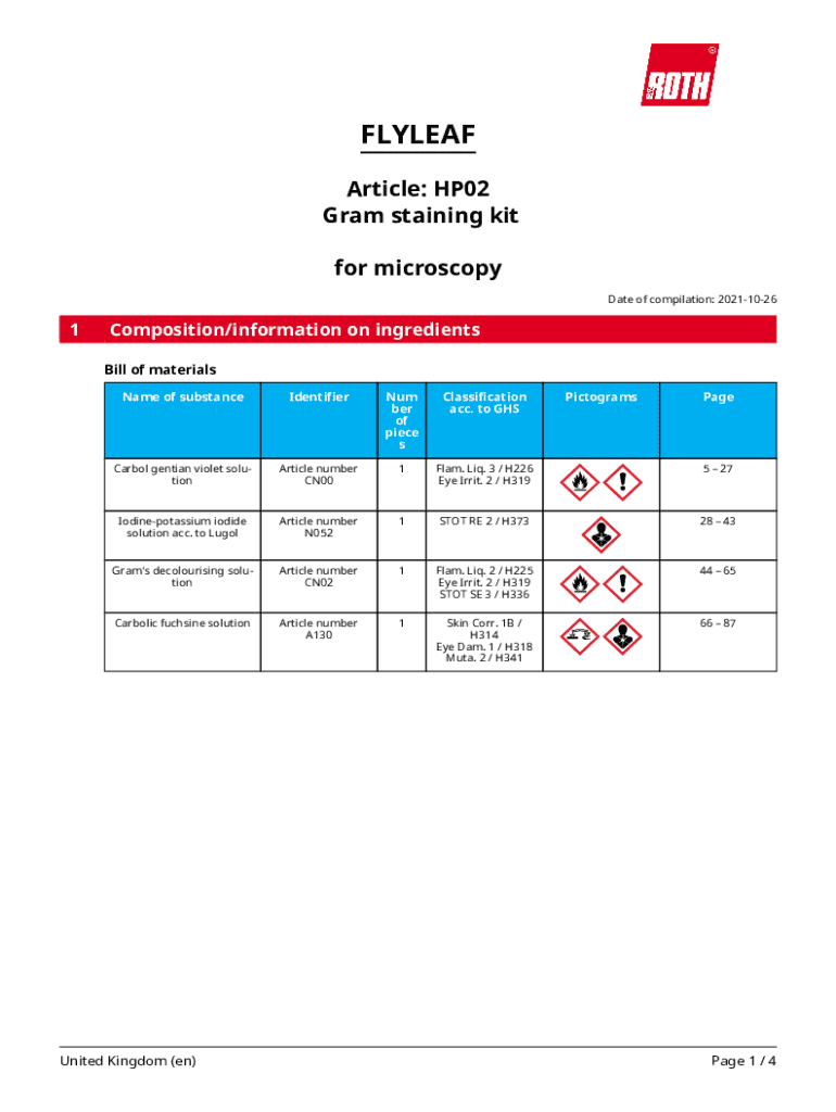 This document provides detailed safety and handling information for the Gram staining kit, including composition, hazards identification, transport information, first aid measures, and instructions for safe usage.