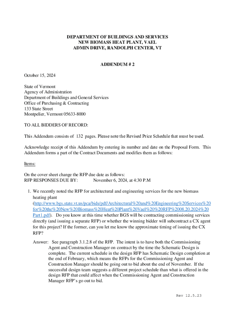 DEPARTMENT OF BUILDINGS AND SERVICES NEW BIOMASS HEAT PLANT, VAEL ADMIN DRIVE, RANDOLPH CENTER, VTADDENDUM # 2 October 15, 2024 State of Vermont Agency of Administration Department of Buildings and