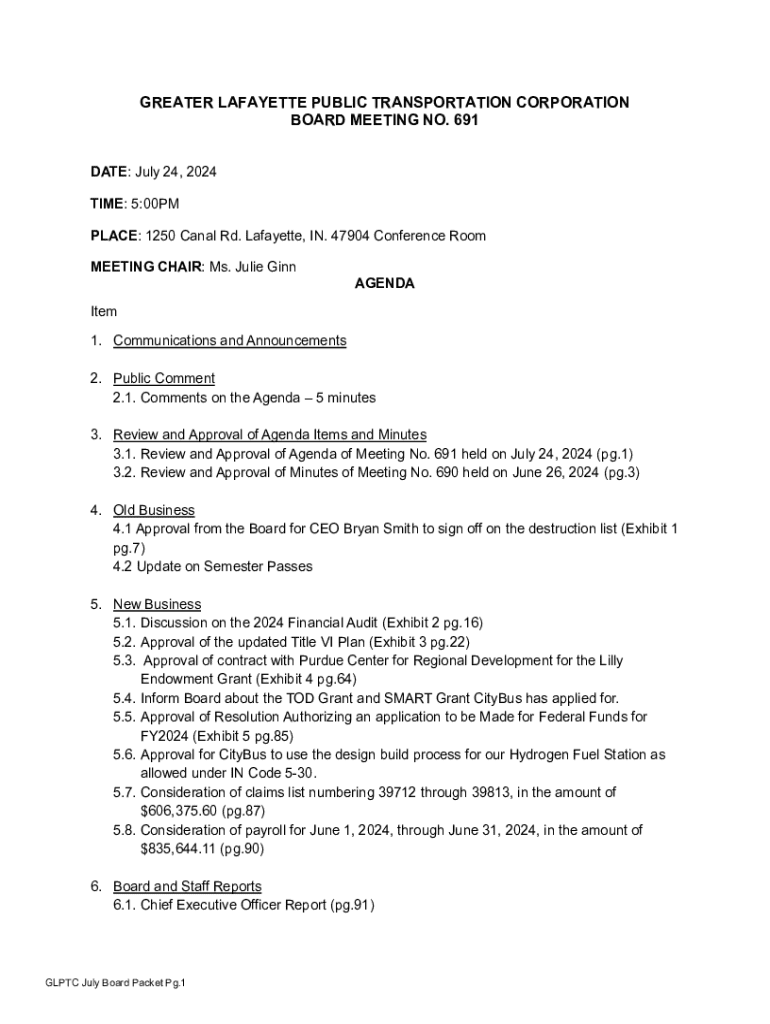GREATER LAFAYETTE PUBLIC TRANSPORTATION CORPORATION BOARD MEETING NO. 691 DATE: July 24, 2024 TIME: 5:00PM PLACE: 1250 Canal Rd. Lafayette, IN. 47904 Conference Room MEETING CHAIR: Ms. Julie GinnAGENDAItem