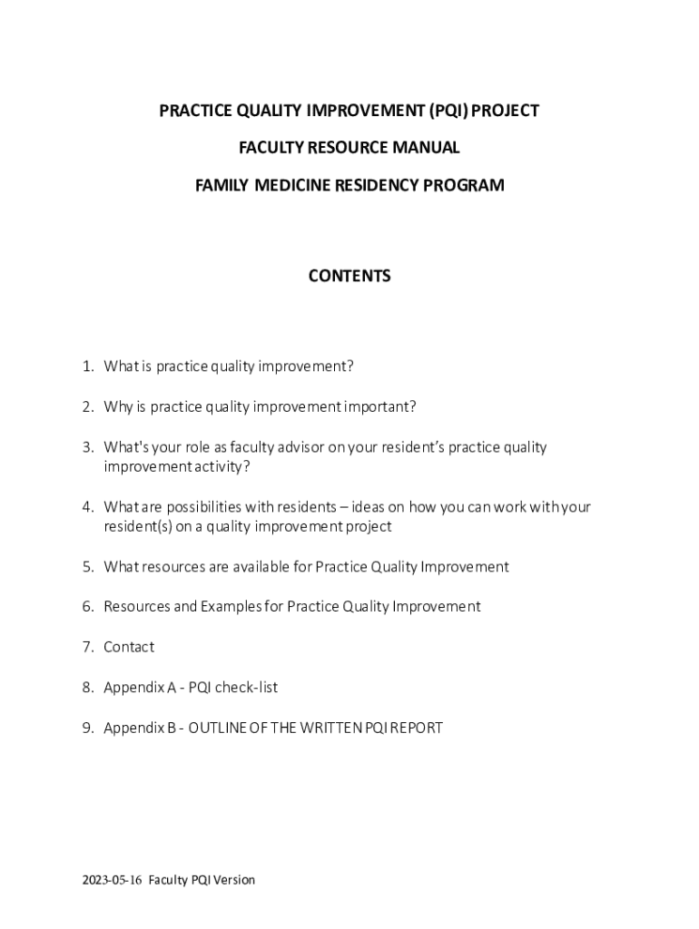 PRACTICE QUALITY IMPROVEMENT (PQI) PROJECT FACULTY RESOURCE MANUAL FAMILY MEDICINE RESIDENCY PROGRAMCONTENTS1. What is practice quality improvement? 2. Why is practice quality improvement important?