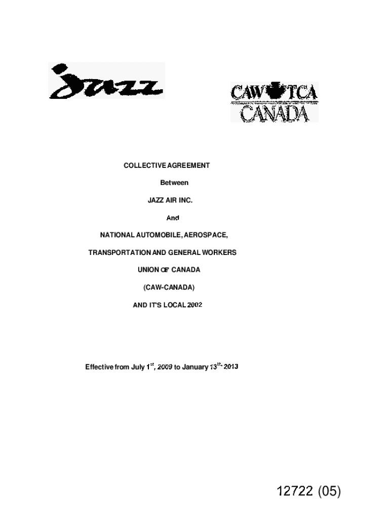 This document outlines the collective agreement between Jazz Air Inc. and the National Automobile, Aerospace, Transportation and General Workers Union of Canada (CAW-Canada), effective from July 1, 2009 to January 13, 2013. It includes details on wages, working conditions, employee rights, union recognition, and various articles concerning management rights, grievance procedures, health and safety, and benefits.