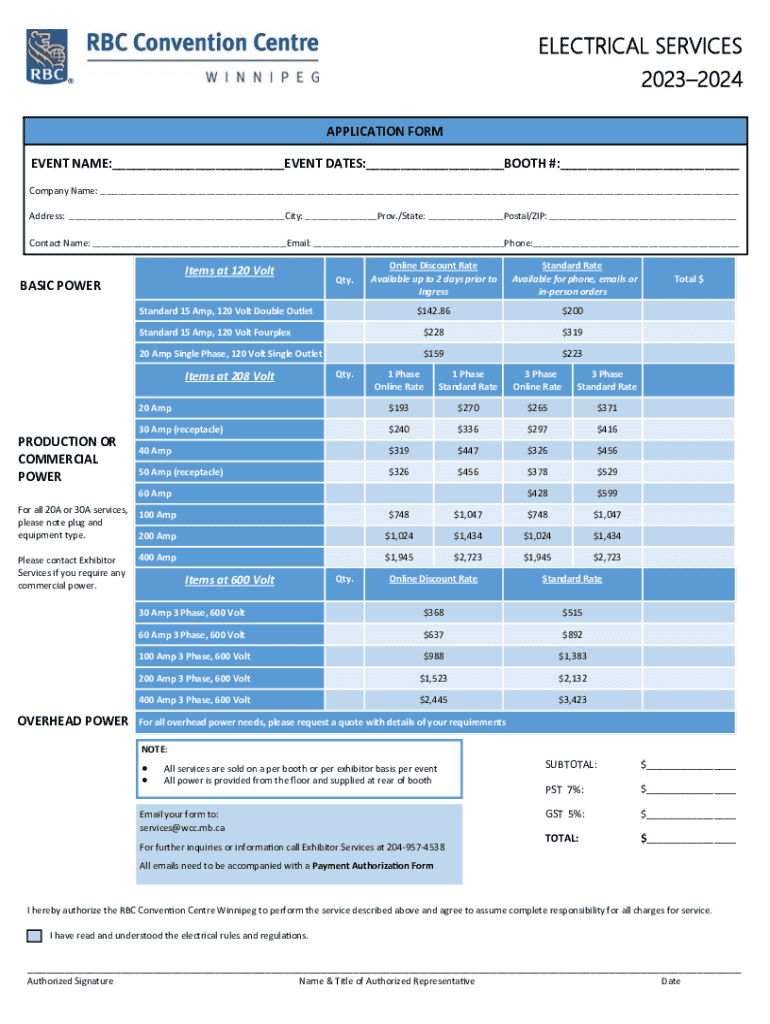 ELECTRICAL SERVICES20232024 APPLICATION FORM EVENT NAME:___EVENT DATES:___BOOTH #:___ Company Name: ___ Address:___City: ___Prov./State: ___Postal/ZIP: ___Contact Name: ___Email: ___Phone:___ Online