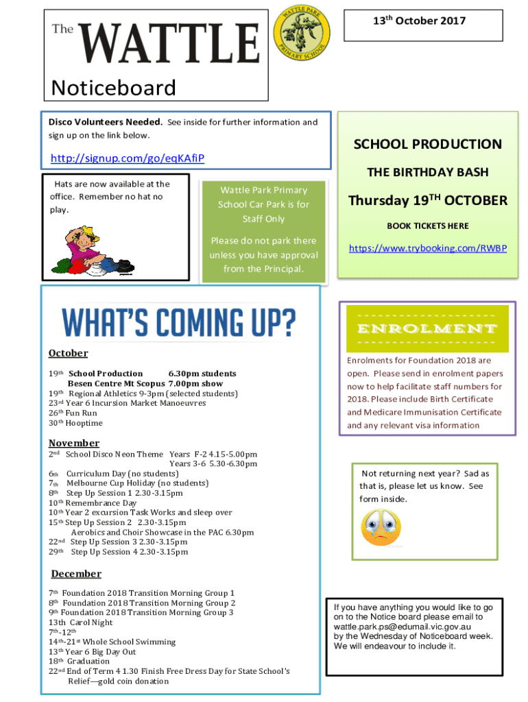 13th October 2017Noticeboard Disco Volunteers Needed. See inside for further information and sign up on the link below.SCHOOL PRODUCTIONhttp://signup.com/go/eqKAfiP Hats are now available at the office.