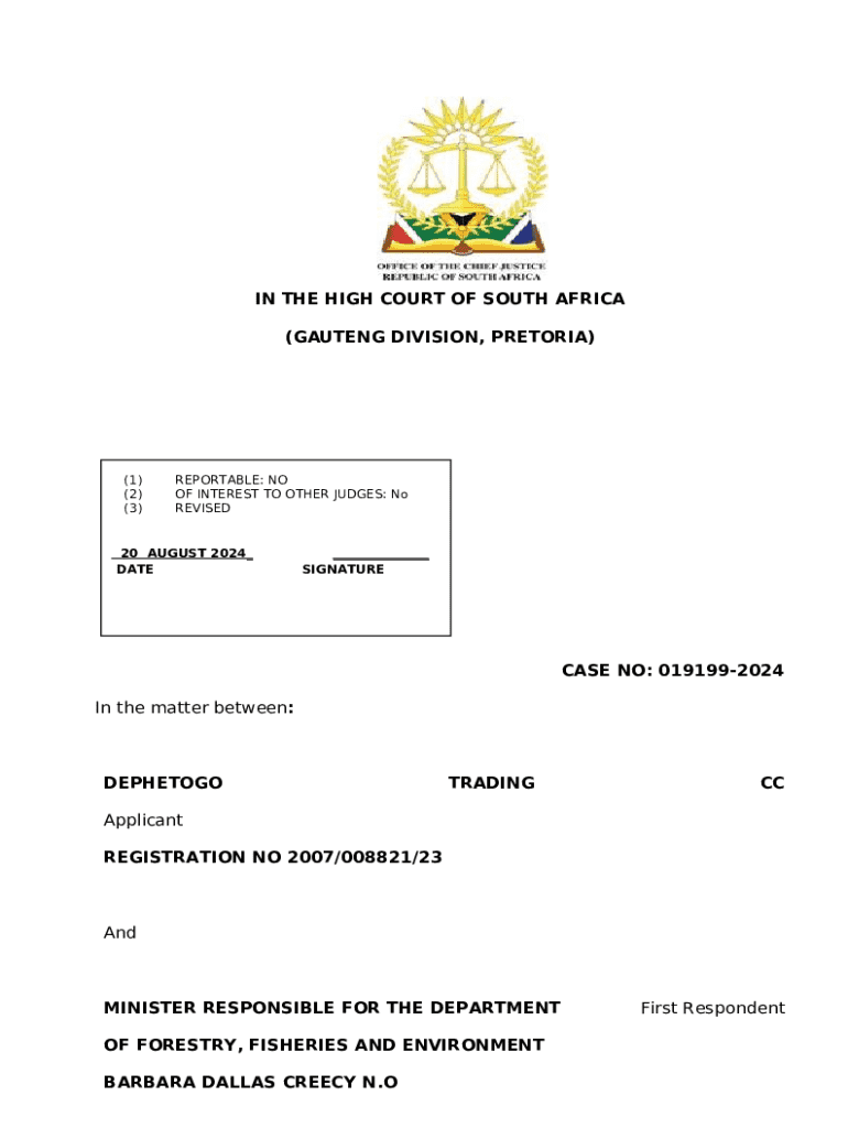 IN THE HIGH COURT OF SOUTH AFRICA (GAUTENG DIVISION, PRETORIA)(1) (2) (3)REPORTABLE: NO OF INTEREST TO OTHER JUDGES: No REVISED20 AUGUST 2024_ DATE___ SIGNATURECASE NO: 0191992024 In the matter between:DEPHETOGOTRADINGCCApplicant
