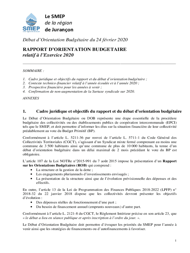 Le SMEP de la rgion de Juranon Dbat dOrientation Budgtaire du 24 fvrier 2020 RAPPORT DORIENTATION BUDGETAIRE relatif lExercice 2020 ___ SOMMAIRE : 1. 2. 3. 4.Cadre juridique et objectifs du rapport