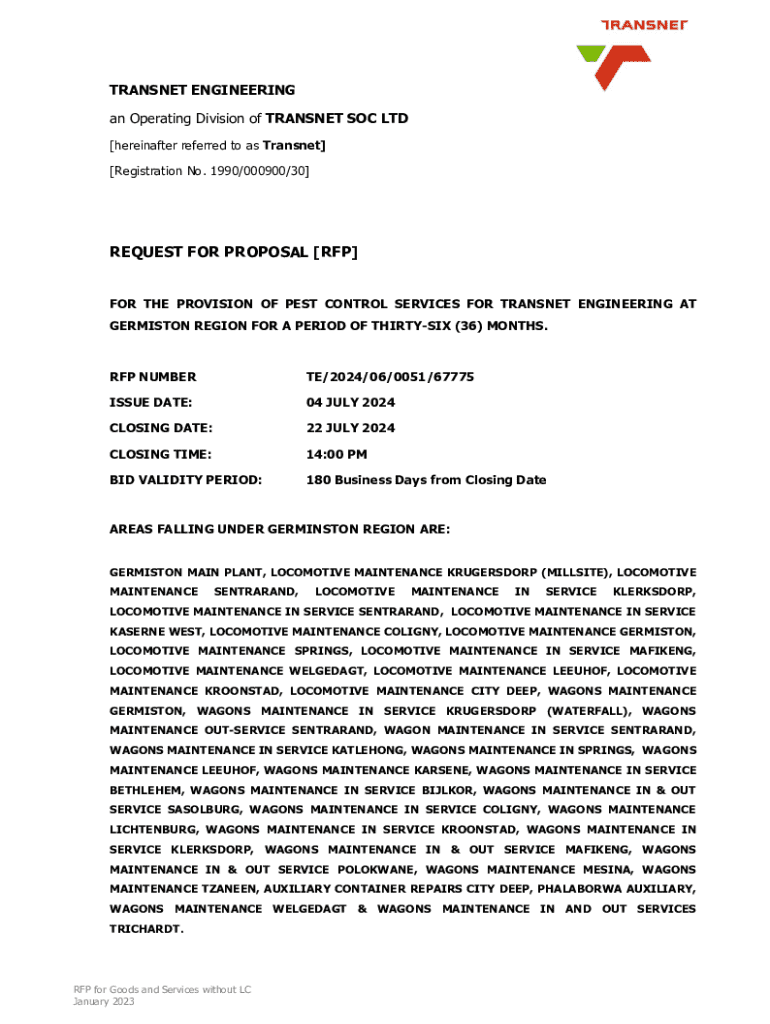 TRANSNET ENGINEERING an Operating Division of TRANSNET SOC LTD [hereinafter referred to as Transnet] [Registration No. 1990/000900/30]REQUEST FOR PROPOSAL [RFP] FOR THE PROVISION OF PEST CONTROL SERVICES