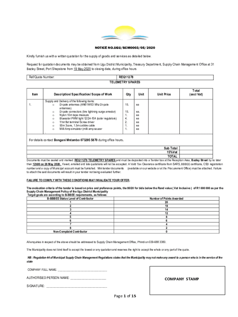 This document is a formal notice inviting quotations for the supply of telemetry spares by the Ugu District Municipality. It outlines the specifications of required items, submission instructions for quotations, and compliance requirements related to tax clearance and B-BBEE certifications. The document also details the evaluation criteria for bids and the conditions under which tenders may be invalidated.
