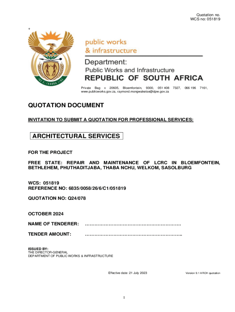 Quotation no. WCS no: 051819 +Private Bag x 20605, Bloemfontein, 9300, 051 408 www.publicworks.gov.za, raymond.mongwaketse@dpw.gov.za7327,066 1967161,QUOTATION DOCUMENT INVITATION TO SUBMIT A QUOTATION