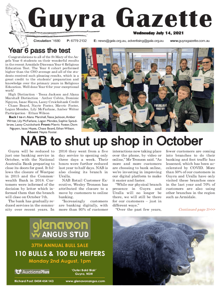 G uyra G azette Wednesday July 14, 2021Circulation `1680P: 6779 2132E: news@gala.org.au, advertising@gala.org.auwww.guyragazette.com.auYear 6 pass the test Congratulations to all of the St Mary of