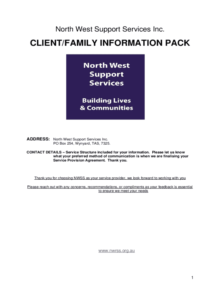 North West Support Services Inc.CLIENT/FAMILY INFORMATION PACKADDRESS: North West Support Services Inc. PO Box 254, Wynyard, TAS, 7325. CONTACT DETAILS Service Structure included for your information.