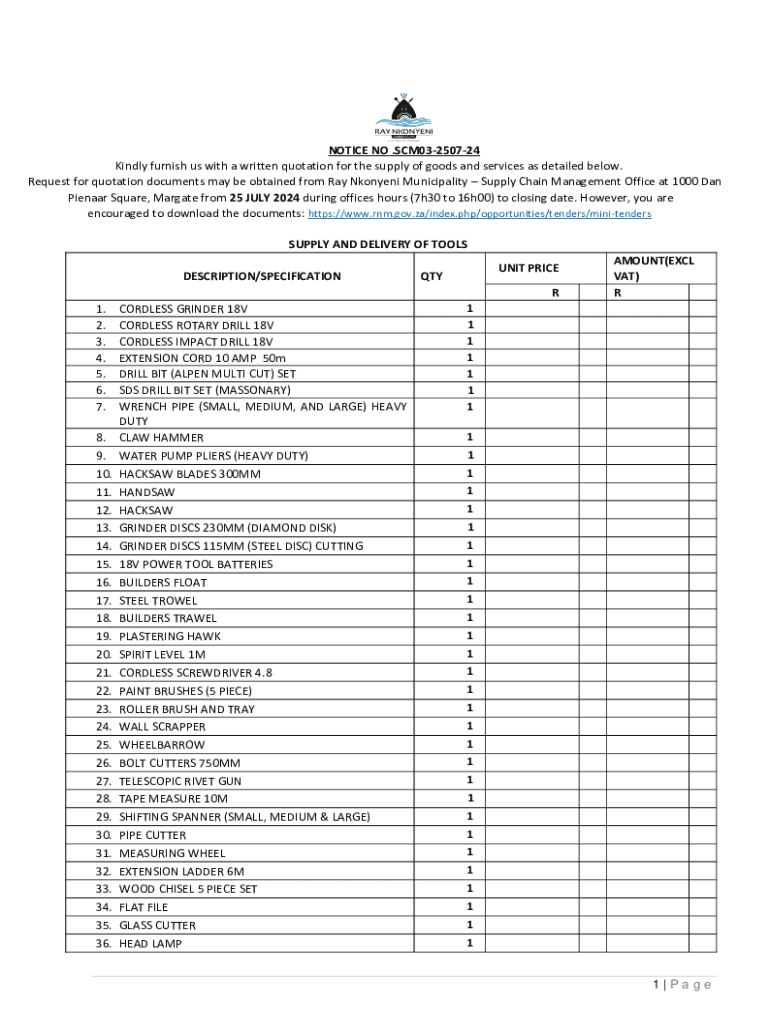 This document serves as a notice inviting bidders to submit written quotations for the supply and delivery of various tools and services as specified. Interested parties can obtain the quotation documents from the Ray Nkonyeni Municipality\'s Supply Chain Management Office or download them from the municipality\'s website. The deadline for submission is no later than 12pm on 1 AUGUST 2024, following a compulsory clarification meeting on 29 JULY 2024.