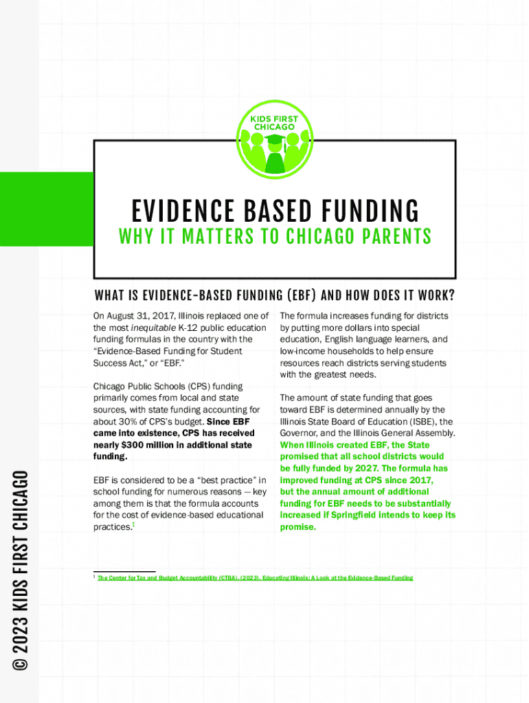 KIDS FIRST CHICAGOEVIDENCE BASED FUNDINGWHY IT MATTERS TO CHICAGO PARENTS WHAT IS EVIDENCEBASED FUNDING (EBF) AND HOW DOES IT WORK? On August 31, 2017, Illinois replaced one of the most inequitable