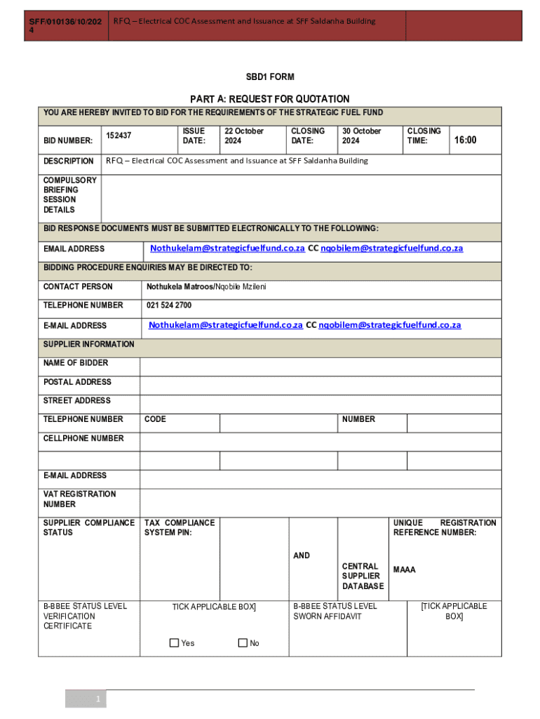 RFQ Electrical COC Assessment and Issuance at SFF Saldanha BuildingSFF/010136/10/202 4SBD1 FORMPART A: REQUEST FOR QUOTATION YOU ARE HEREBY INVITED TO BID FOR THE REQUIREMENTS OF THE STRATEGIC FUEL