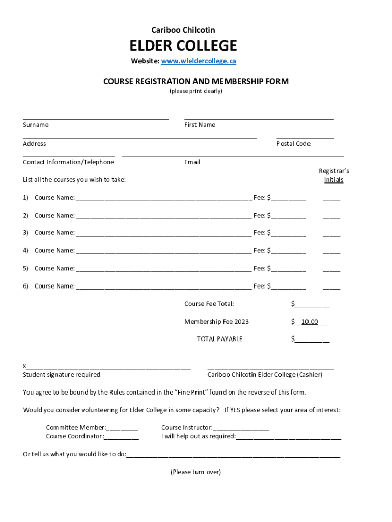 Cariboo ChilcotinELDER COLLEGE Website: www.wleldercollege.caCOURSE REGISTRATION AND MEMBERSHIP FORM (please print clearly)______SurnameFirst Name______AddressPostal Code___ ___ Contact Information/TelephoneEmail