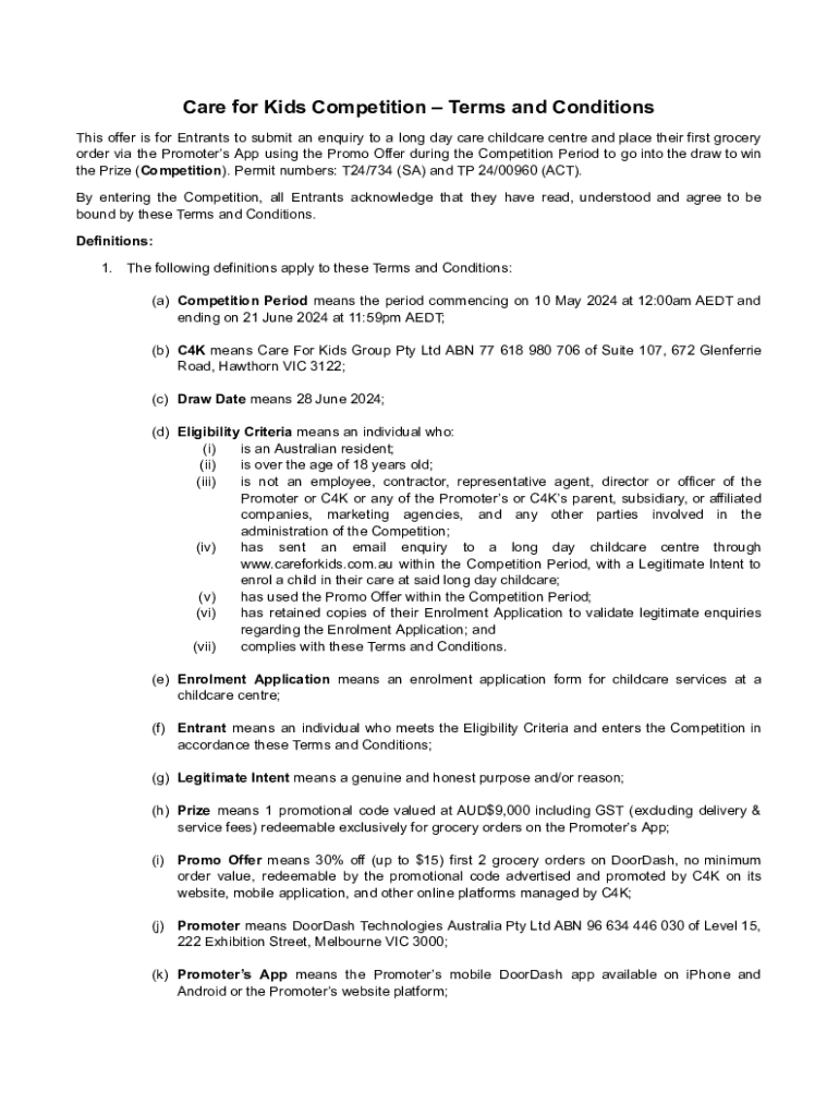 Care for Kids Competition Terms and Conditions This offer is for Entrants to submit an enquiry to a long day care childcare centre and place their first grocery order via the Promoters App using the