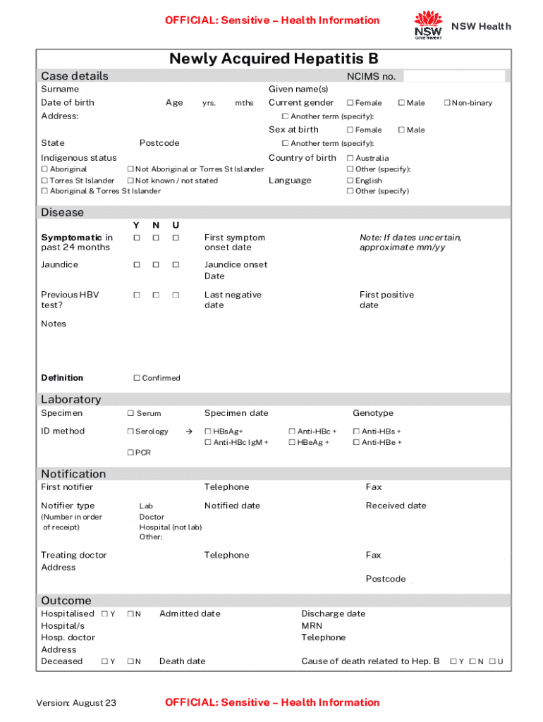 This document is an official notification form used by NSW Health to gather detailed information about newly acquired Hepatitis B cases. It includes fields for personal information, symptom history, risk factors, exposure history, and doctor notification details.