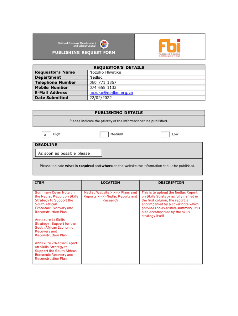 This document is a request form for publishing the Nedlac Report on Skills Strategy to Support the South African Economic Recovery and Reconstruction Plan. It includes details from the requestor, the priority of the publication, and specific instructions on where the information should be posted on the Nedlac website.