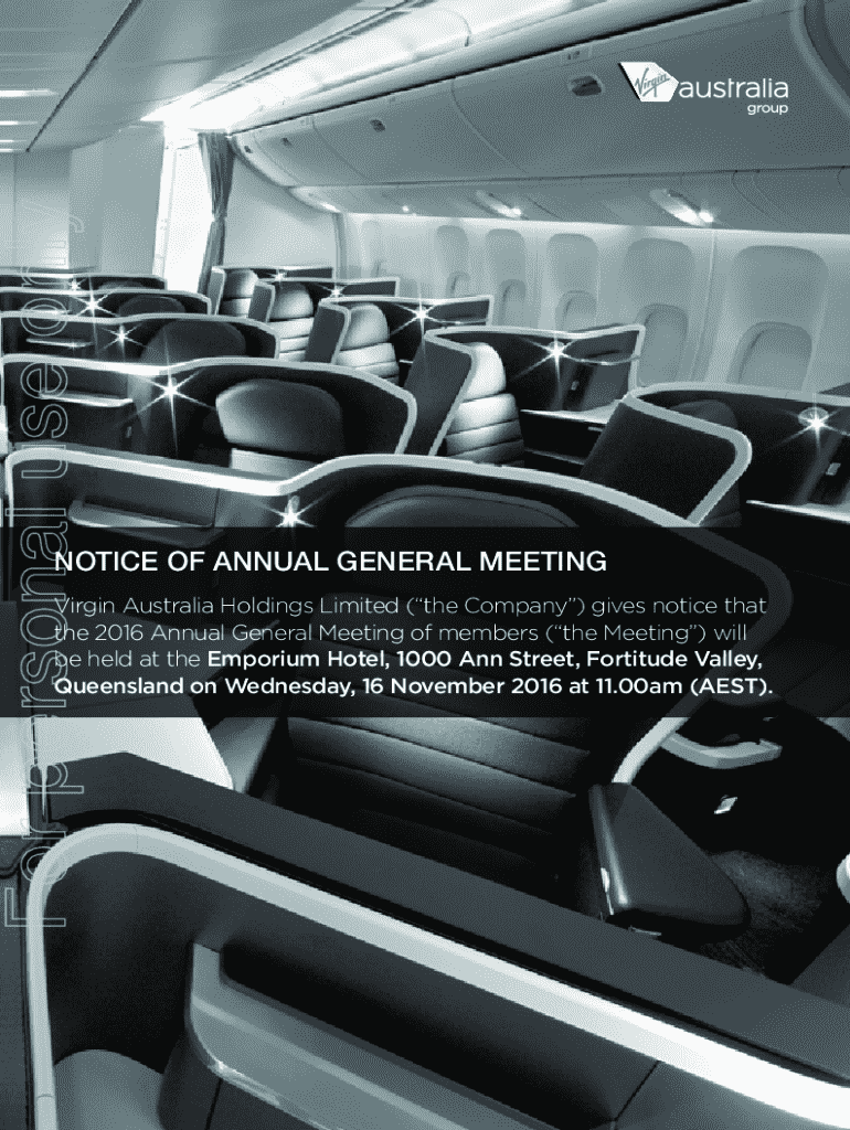 This document provides the notice for the Annual General Meeting of Virgin Australia Holdings Limited scheduled for November 16, 2016. It includes the agenda, resolutions to be considered, and voting procedures. Key points discussed involve financial reports, election of directors, amendments to the company constitution, and remuneration reports.