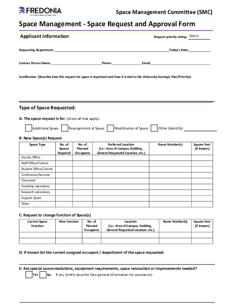 To fill out a space request and approval, individuals should complete a designated form that includes details such as the purpose of the request, the type of space needed, duration of use, and any special requirements.