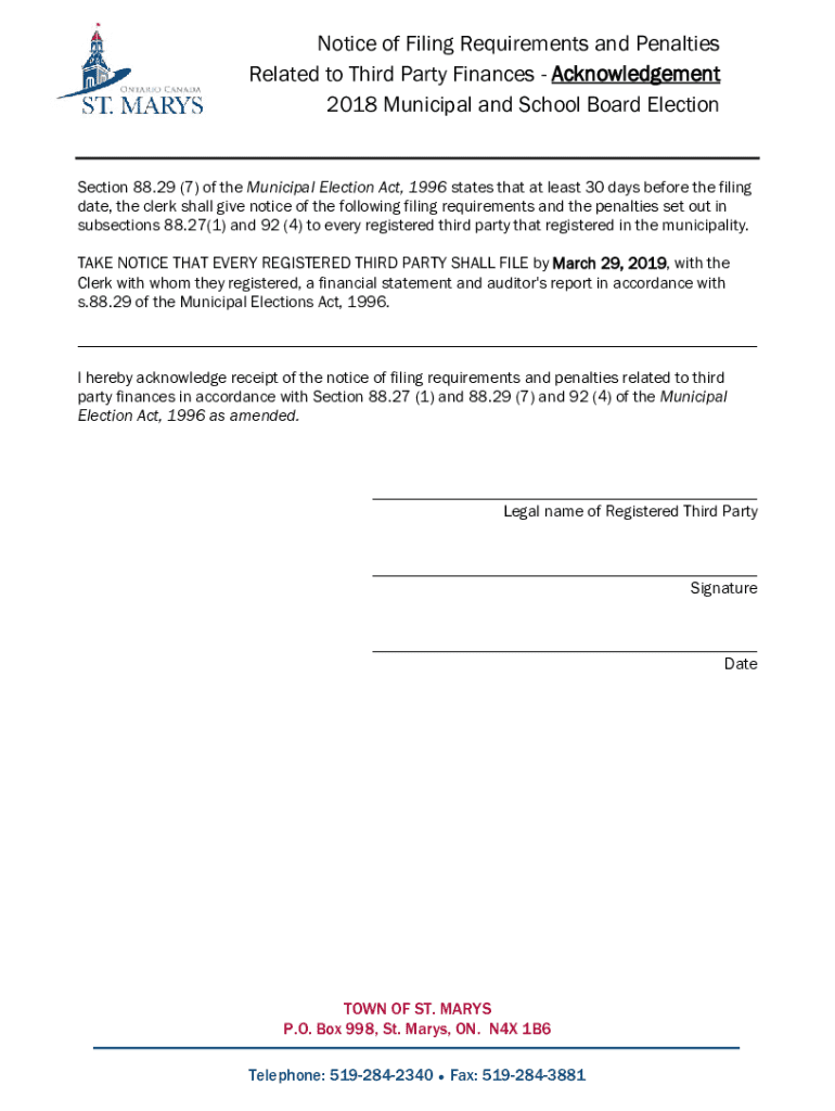 This document serves as a notice for registered third parties regarding the filing requirements and penalties associated with the Municipal and School Board Election, as mandated by the Municipal Election Act, 1996. It outlines the necessity of filing a financial statement and auditor\'s report by a specific deadline.