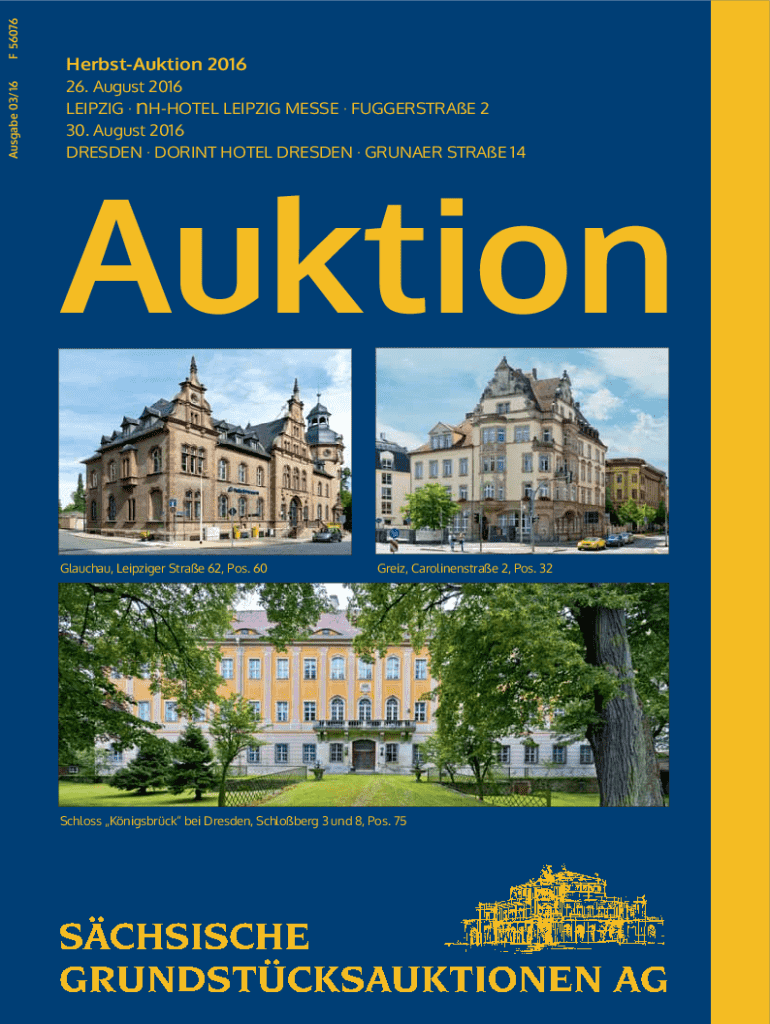 F 56076 Ausgabe 03/ 16HerbstAuktion 2016 26. August 2016 LEIPZIG nHHOTEL LEIPZIG MESSE FUGGERSTRAE 2 30. August 2016 DRESDEN DORINT HOTEL DRESDEN GRUNAER STRAE 14Auktion Glauchau, Leipziger Strae