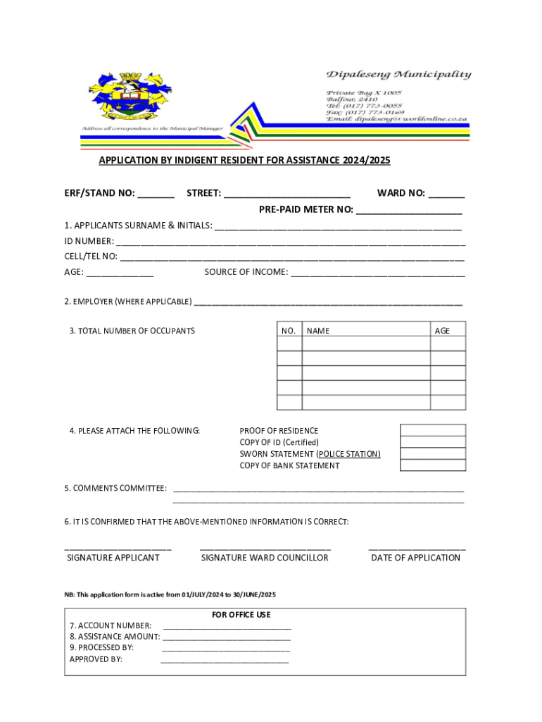 APPLICATION BY INDIGENT RESIDENT FOR ASSISTANCE 2024/2025 ERF/STAND NO: ___STREET: ___WARD NO: ___PREPAID METER NO: ___ 1. APPLICANTS SURNAME & INITIALS: ___ ID NUMBER: ___ CELL/TEL NO: ___ AGE: ___SOURCE