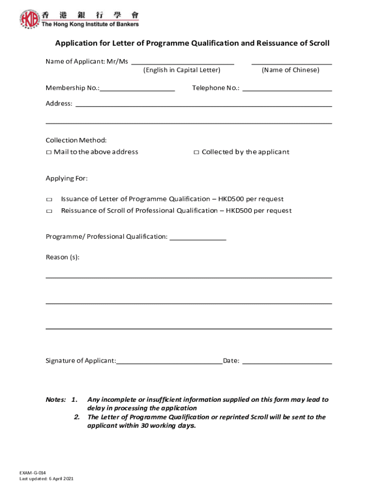 Application for Letter of Programme Qualification and Reissuance of Scroll Name of Applicant: Mr/Ms (English in Capital Letter) Membership No.:(Name of Chinese)Telephone No.:Address:Collection Method: