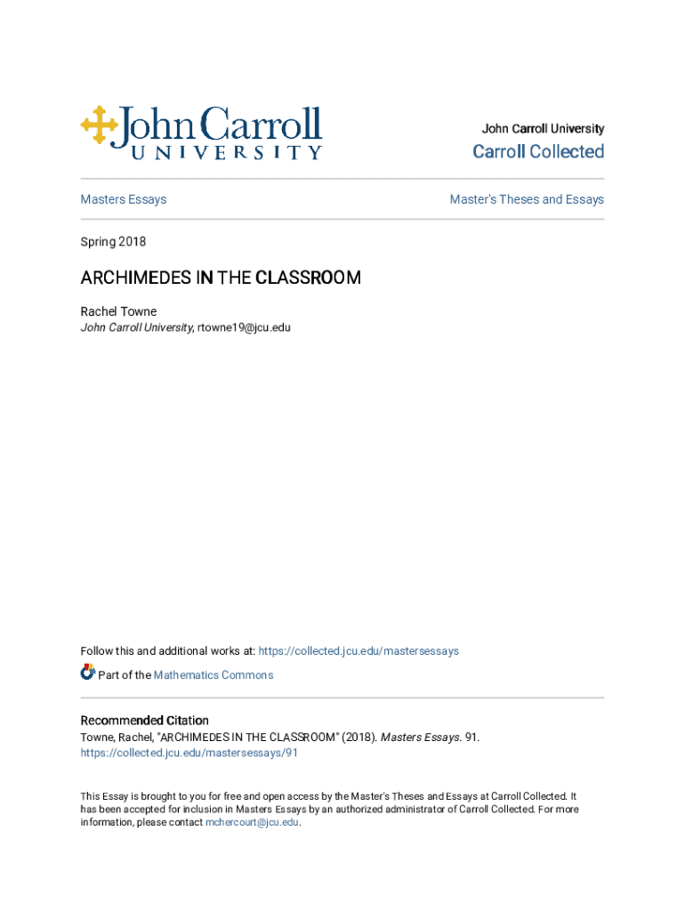 This essay explores the contributions of Archimedes to mathematics, his methods, and how his work can be integrated into classroom teaching. It covers various topics including the law of the lever, volume of irregular solids, the Sand Reckoner, and more, along with lesson plans that incorporate Archimedes\' historical findings into educational activities.