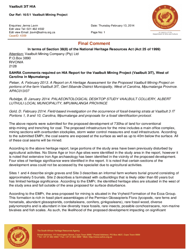 The project developers and mining companies responsible for the Vaalbult Mining Project are required to file the HIA.