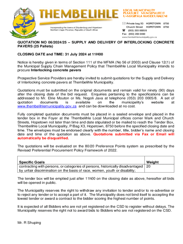 Get the free QUOTATION NO 06/2024/25 SUPPLY AND DELIVERY OF INTERLOCKING CONCRETE - thembelihlemu...