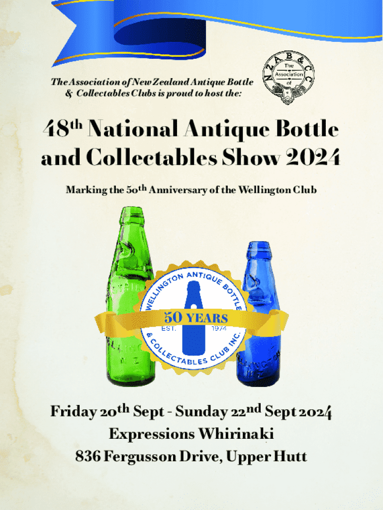 The 48th National Antique Bottle and Collectables Show will be held from September 20 to 22, 2024, at Expressions Whirinaki, Upper Hutt, marking the 50th anniversary of the Wellington Club. The event includes auctions, exhibit judging, and displays from various categories of bottles and collectables.