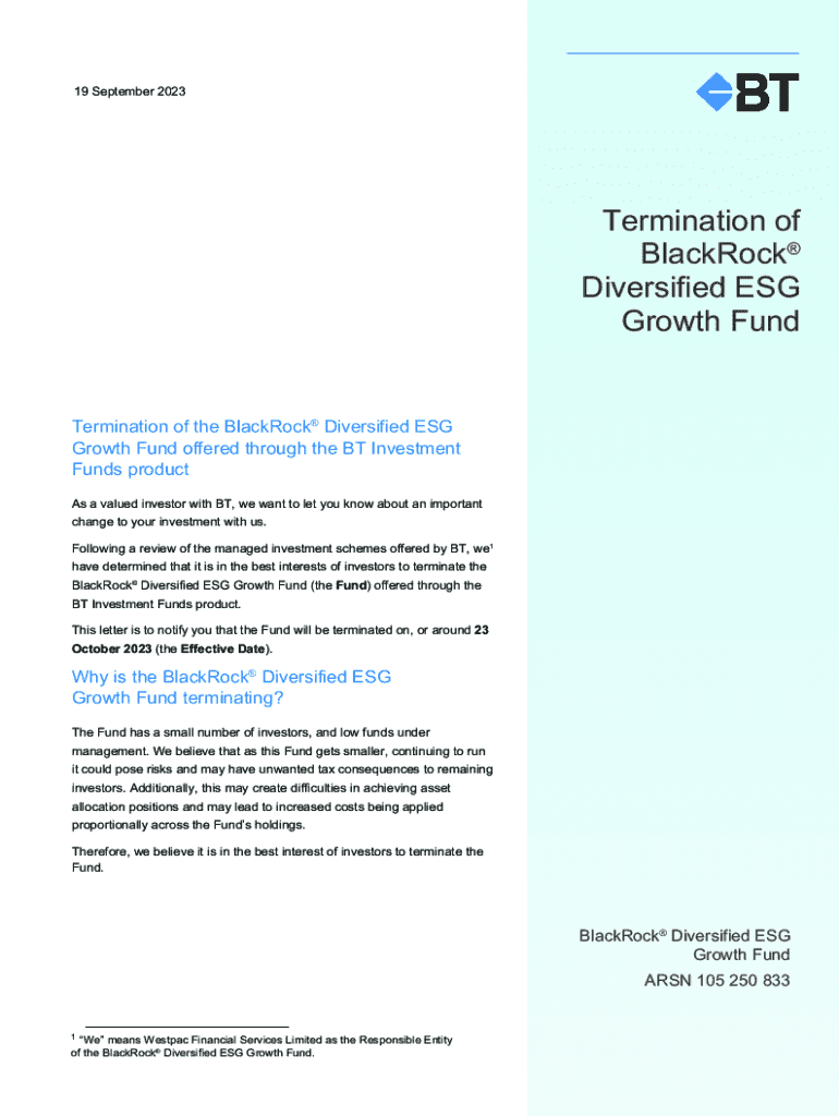 19 September 2023Termination of BlackRock Diversified ESG Growth FundTermination of the BlackRock Diversified ESG Growth Fund offered through the BT Investment Funds product As a valued investor with