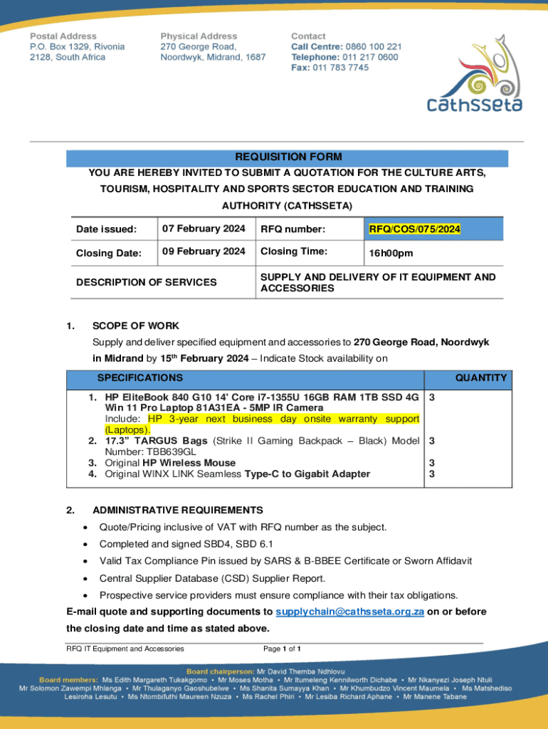 REQUISITION FORM YOU ARE HEREBY INVITED TO SUBMIT A QUOTATION FOR THE CULTURE ARTS, TOURISM, HOSPITALITY AND SPORTS SECTOR EDUCATION AND TRAINING AUTHORITY (CATHSSETA) Date issued:07 February 2024RFQ
