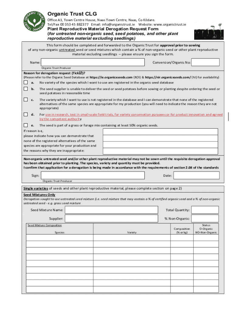Organic Trust CLG Office A1, Town Centre House, Naas Town Centre, Naas, Co Kildare. Tel/Fax 00 353 45 882377 Email: info@organictrust.ie Website: www.organictrust.iePlant Reproductive Material Derogation