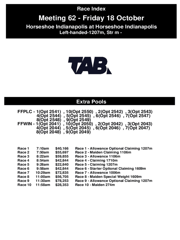 Race IndexMeeting 62 Friday 18 October Horseshoe Indianapolis at Horseshoe Indianapolis Lefthanded1207m, Str m Extra Pools FFPLC 1(Opt 2541) 4(Opt 2544) 8(Opt 2548) FFWIN 1(Opt 2041) 4(Opt 2044) 8(Opt
