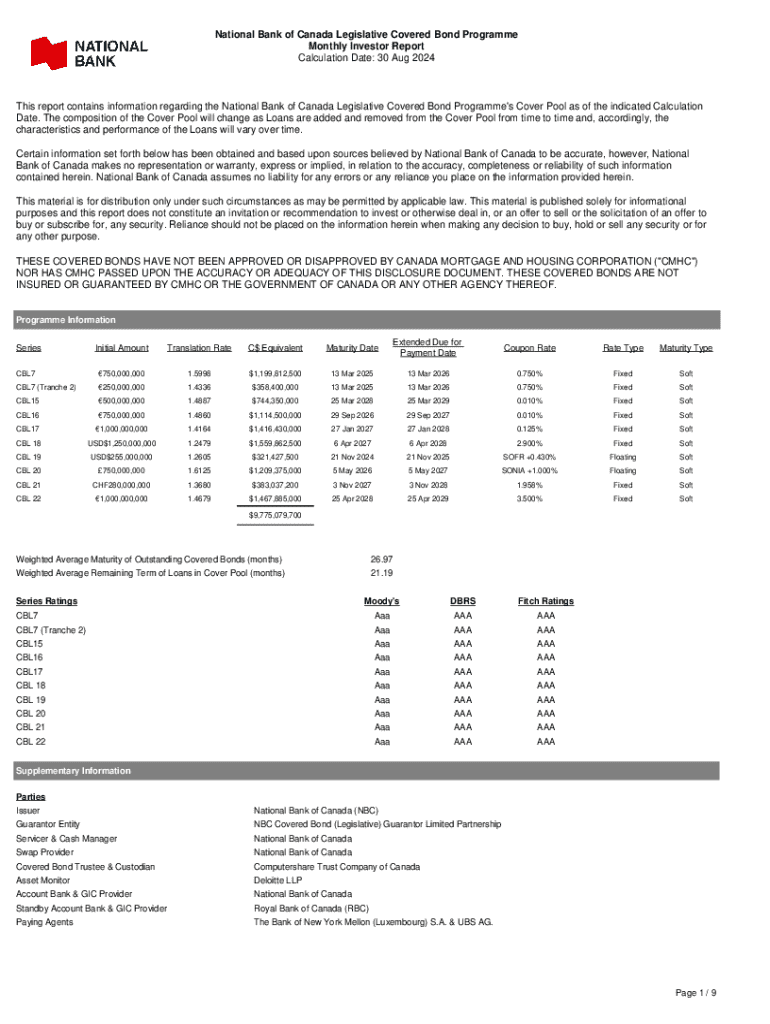 This report provides detailed information regarding the National Bank of Canada\'s Legislative Covered Bond Programme, including its cover pool composition, asset coverage tests, ratings, and other pertinent financial metrics as of the calculation date. It is intended for informational purposes and does not constitute investment advice.