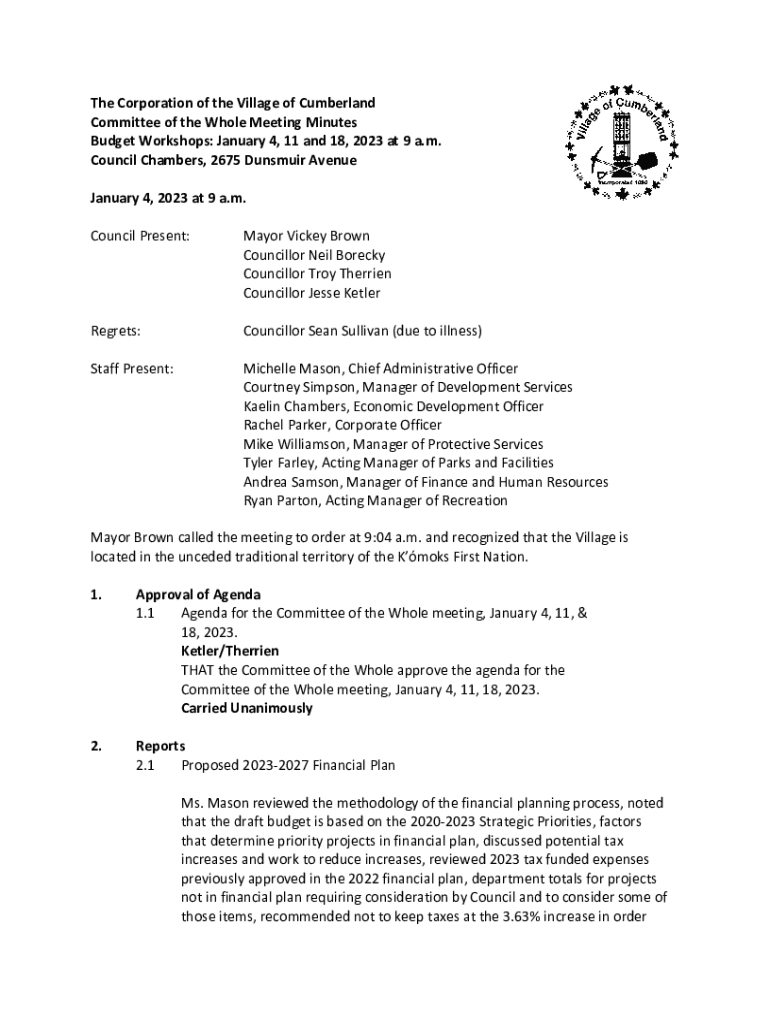 The Corporation of the Village of Cumberland Committee of the Whole Meeting Minutes Budget Workshops: January 4, 11 and 18, 2023 at 9 a.m. Council Chambers, 2675 Dunsmuir Avenue January 4, 2023 at